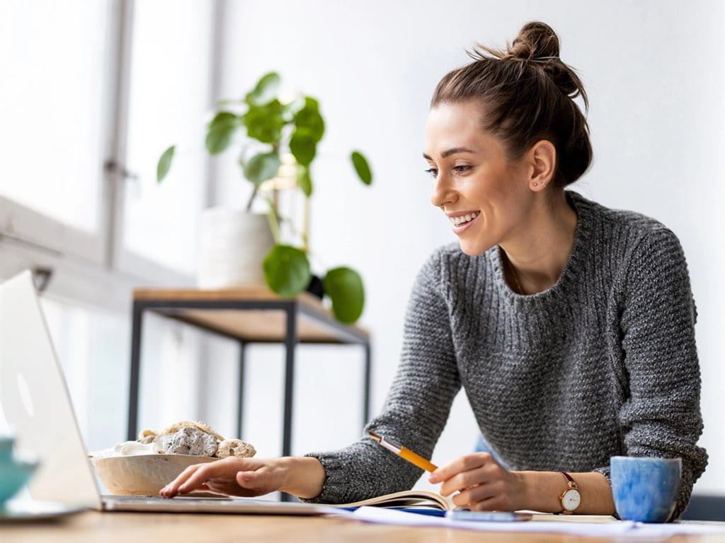 Eine Frau sitzt vor einem Laptop