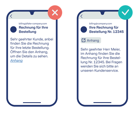 - Alles in Ordnung: Die echte E-Mail verwendet die tatsächliche Domain des Unternehmens, einen Betreff mit spezifischer Angaben und einen Anhang, der sicher ist.