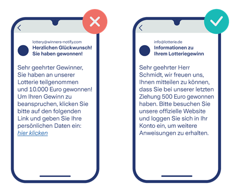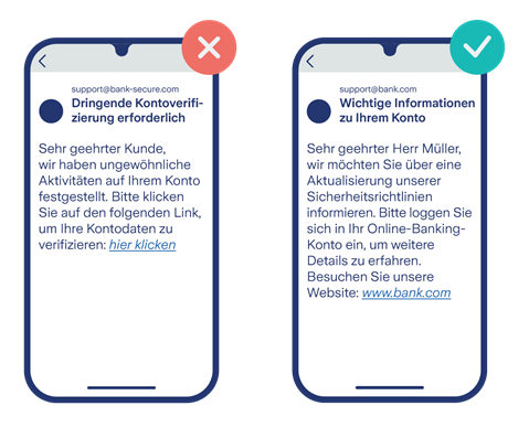 Hier finden Sie Beispiele für betrügerische Nachrichten zu verschiedenen Themen und zum Vergleich jeweils eine seriöse Anfrage: