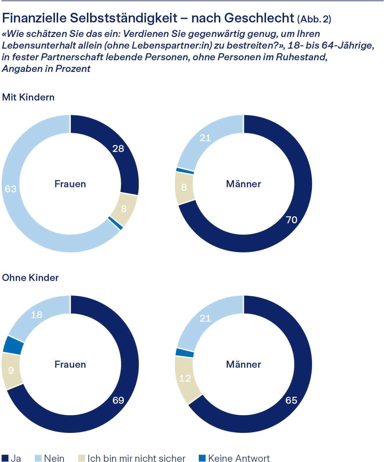 So sagen zwei Drittel der Frauen mit Kindern, dass sie aktuell allein mit ihrem Einkommen nicht auf eigenen Beinen stehen könnten. Bei den Männern und Frauen ohne Kinder sind es hingegen nur rund ein Fünftel (siehe Abb. 2).