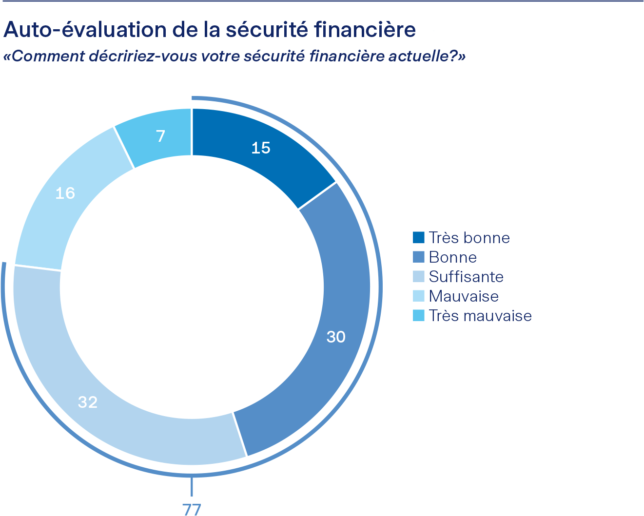 Les Suisses se sentent financièrement en sécurité – 77% estiment que leur sécurité financière actuelle est au moins suffisante. Chez les plus de 65 ans, ce chiffre atteint même 93% – la part du lion des retraités n’a pas de soucis financiers. En moyenne, les personnes interrogées ont besoin de CHF 19’600 d’épargne pour se sentir en sécurité dans leur situation de vie actuelle, soit environ quatre salaires mensuels moyens. Cette somme peut toutefois être très différente d’un individu à l’autre et dépend notamment beaucoup de l’âge.