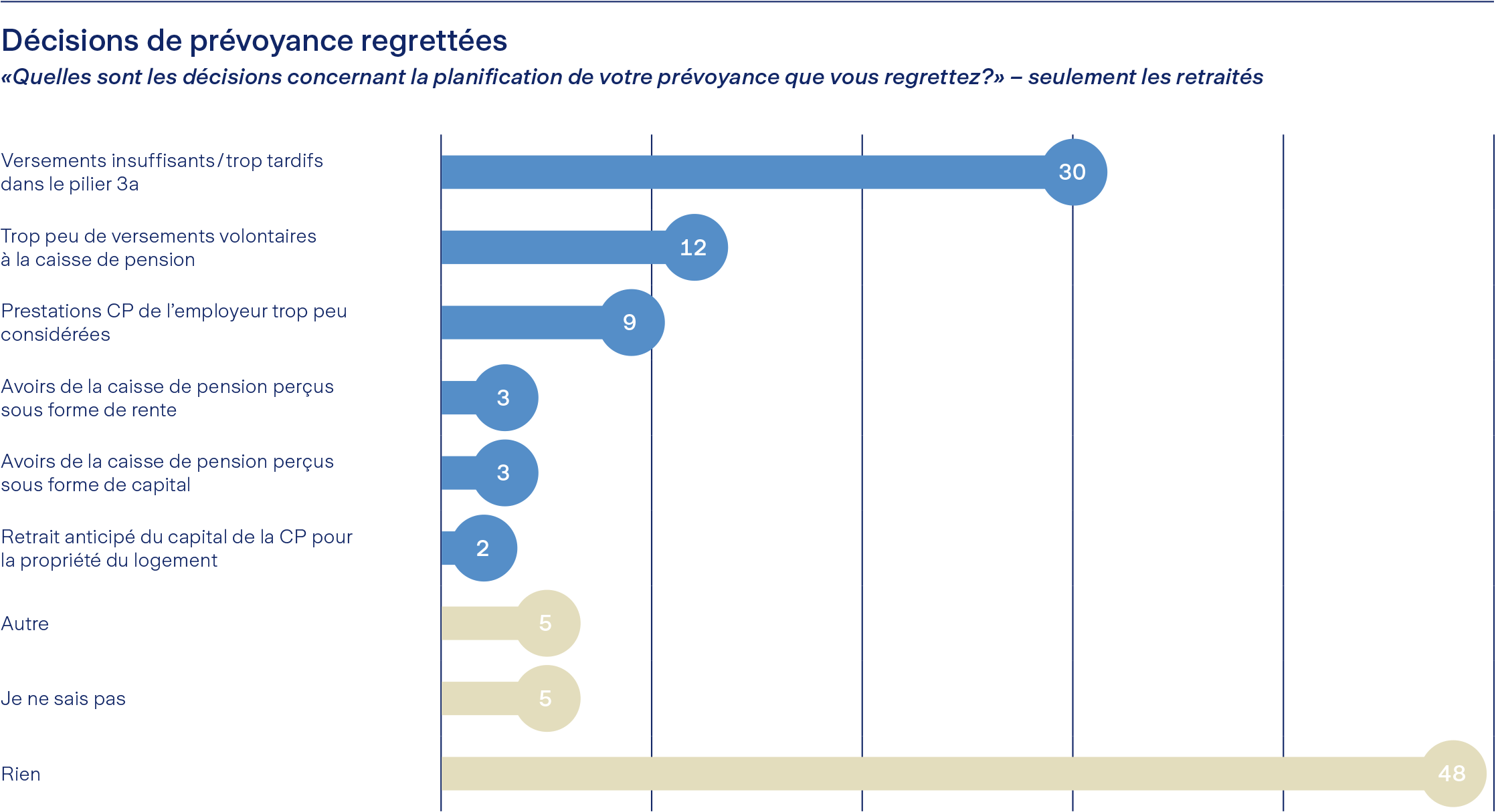 «Si seulement j’avais fait plus pour ma prévoyance», telle est la réflexion que se font de nombreuses personnes en Suisse. Dans le cadre de l’étude «Fairplay», les retraités ont été interrogés pour savoir s’ils regrettaient rétrospectivement les décisions prises en matière de prévoyance. Près de la moitié d’entre eux ont des regrets. Les raisons suivantes ont été le plus souvent citées. 30% répondent qu’ils ont cotisé trop peu ou trop tard dans le pilier 3a, 12% regrettent d’avoir trop peu cotisé volontairement dans la prévoyance professionnelle et 9% n’ont pas assez tenu compte des prestations de leur caisse de pension.