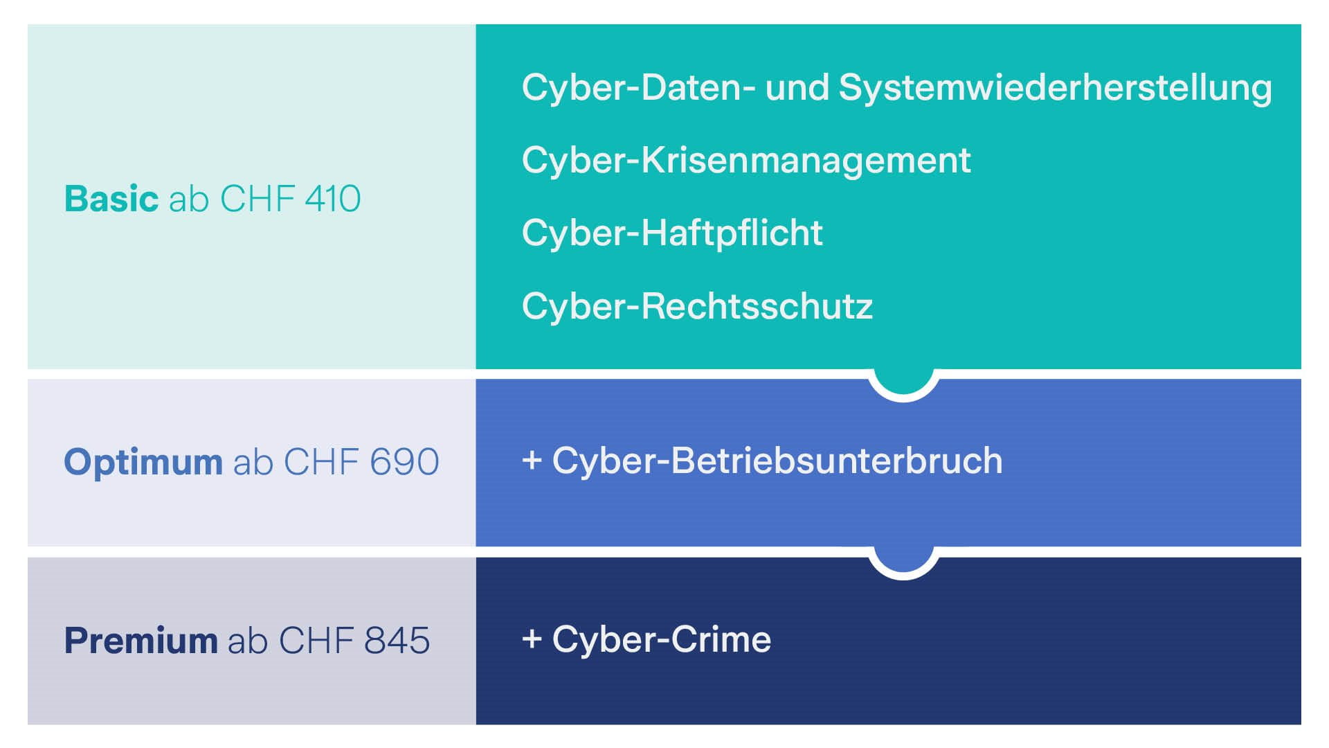 Il costo di una cyber assicurazione dipende dalle dimensioni dell’azienda, dal ramo, dal tipo e dal volume dei dati, dalla franchigia e dall’estensione della copertura. Il costo del premio può variare da poche centinaia a diverse migliaia di franchi all’anno. La variante Basic della nostra cyber assicurazione, ad esempio, costa 410 franchi all’anno.