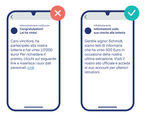 Fate attenzione a queste anomalie. Se non siete sicuri dell’affidabilità di un destinatario o di una destinataria, vi consigliamo di cercare su Internet il sito ufficiale e di informarvi.