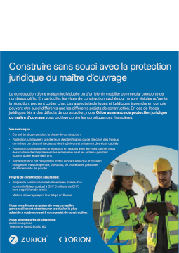 Construire sans souci avec la protection juridique du maître d’ouvrage La construction d’une maison individuelle ou d’un bien immobilier commercial comporte de nombreux défis. En particulier, les vices de construction cachés qui ne sont visibles qu’après la réception, peuvent coûter cher. Les aspects techniques et juridiques à prendre en compte peuvent être aussi différents que les différents projets de construction. En cas de litiges juridiques liés à des défauts de construction, notre Orion assurance de protection juridique du maître d’ouvrage vous protège contre les conséquences financières. Vos avantages: • Conseil juridique pendant la phase de construction • Protection juridique en cas d’erreurs de planification ou de direction des travaux commises par des architectes ou des ingénieurs et entraînant des vices cachés • Protection juridique après la réception en rapport avec les vices cachés issus des contrats d’entreprise avec les entrepreneurs et les artisans pendant toute la durée légale de 5 ans • Représentation par des juristes et des avocats ainsi que et prise en charge des frais d’expertise, d’avocats, de procédures judiciaires et d’indemnités de procès Projets de construction assurables: • Projets de construction de bâtiments en Suisse d’un montantinférieur ou égal à CHF 5 millions de CHF, hors acquisition de terrain • Maîtres d‘ouvrage ayant leur siège en Suisse Nous nous ferons un plaisir de vous conseiller personnellement et de trouver la solution la plus adaptée à vos besoins et à votre projet de construction: Nous sommes près de chez vous: zurich.ch/agence Téléphone 0800 80 80 80