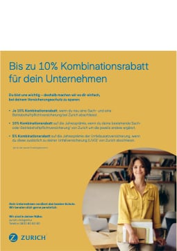 • Je 10% Kombinationsrabatt, wenn du neu eine Sach- und eine Betriebshaftpflichtversicherung bei Zurich abschliesst.
