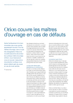 «Dans de nombreux cas, il n’est pas non plus possible de déterminer claire- ment la cause du dommage après avoir emménagé dans le bien immobilier. Une assurance de protection juridique à ses côtés est utile dans ces mo- ments-là.» La nouvelle assurance de protection juridique maître d’ouvrage d’Orion intervient précisément ici et comble une lacune en matière de sécu- rité. Grâce aux dernières adaptations, Zurich et Orion offrent l’une des solu- tions les plus complètes sur le marché suisse. Elles représentent les intérêts légitimes des maîtres d’ouvrage et les aident à obtenir gain de cause.