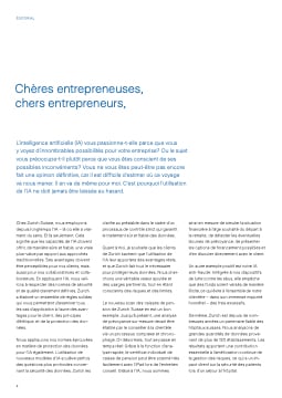 Chez Zurich Suisse, nous employons depuis longtemps l’IA – là où elle a vrai- ment du sens. Et là seulement. Cela signifie que les capacités de l’IA doivent offrir, de manière sûre et fiable, une vraie plus-value par rapport aux approches traditionnelles. Ses avantages doivent être perceptibles pour nos clients, mais aussi pour nos collaboratrices et colla- borateurs. En appliquant l’IA, nous veil- lons à respecter des normes de sécurité et de qualité clairement définies. Zurich