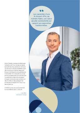 Zurich Suisse continuera à développer l’utilisation de l’IA sur la base de règles bien définies. Nos clientes et clients se- ront servis encore plus rapidement avec des solutions sur mesure, respectant leur profil de risque et leurs préférences individuelles. Nous adopterons une ap- proche prudente avant d’introduire toute nouvelle technologie, afin de garantir