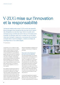 L’entreprise traditionnelle suisse V-ZUG produit des appareils électroménagers haut de gamme tels que des fours à vapeur, des réfrigérateurs et des lave-linge. Dans la nouvelle usine verticale à Zoug, la cliente de Zurich mise sur l’innovation et la durabilité. Par exemple, avant qu’un nouveau four ne soit dispo- nible dans l’entrepôt, il passe par un processus de production complexe dans l’usine à six étages, y compris une étape de chauffage dans un four à 850 degrés.