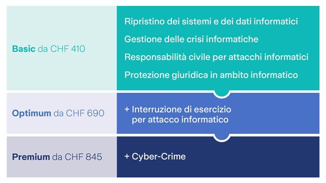 Qualsiasi impresa che elabori, archivi o invii dati sensibili come quelli dei clienti, informazioni sui pagamenti, proprietà intellettuale o altre informazioni riservate è a rischio. Lo stesso vale per tutte le imprese con processi critici per l’attività che dipendono dai loro sistemi IT. Gli attacchi informatici e le violazioni delle norme sulla protezione dei dati sono in aumento. Una cyber assicurazione può contribuire a coprire le perdite finanziarie e i costi per il ripristino dei dati, la responsabilità legale o i danni di reputazione e a garantire la continuità dell’esercizio dell’attività. Ciò vale in particolar modo per le PMI che non dispongono di un proprio reparto di sicurezza IT oppure che dispongono di risorse troppo esigue ma hanno la necessità di avere accesso a specialisti 24 ore su 24.